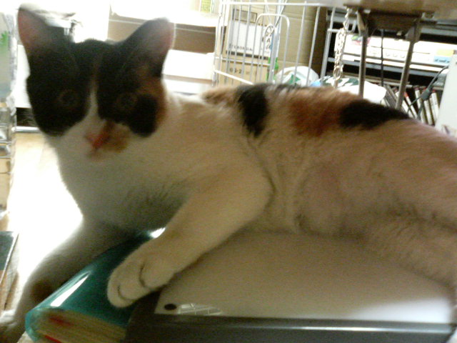 トレス台を、使ってない時は机の下に突っ込んでます。よくトレス台の上に猫が乗ってくつろいでいます。かわゆす。